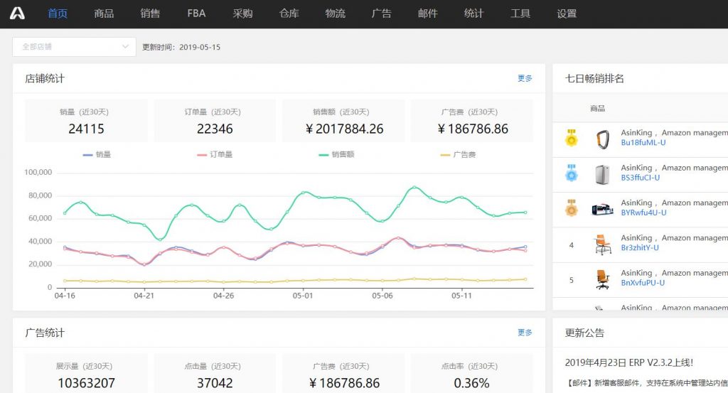 实时同步销量,销售额,广告费,FBA库存量