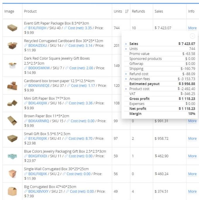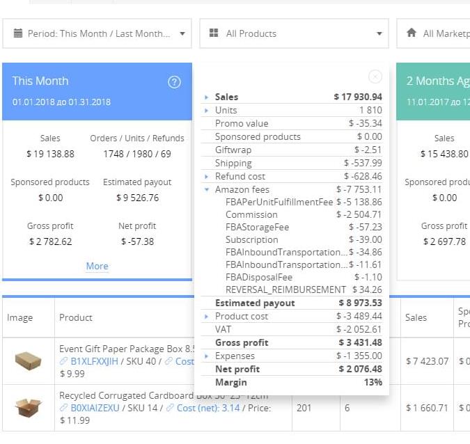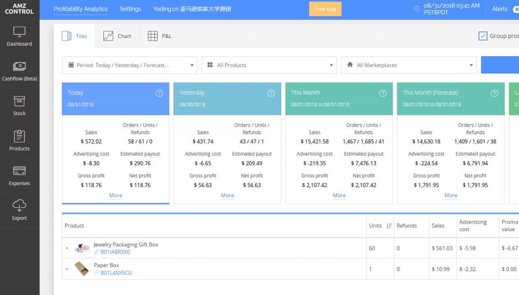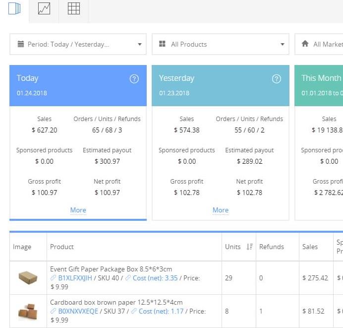 显示有关亚马逊费用的详细信息(例如FBA费用,佣金),PPC支出,退货费用,促销费用和固定费用(例如虚拟助手,预备中心)。 您还可以按时间段(今天,昨天或本月)和按产品查看。