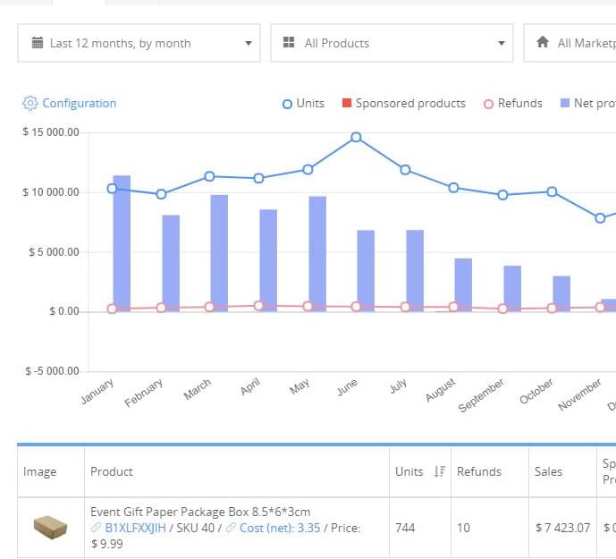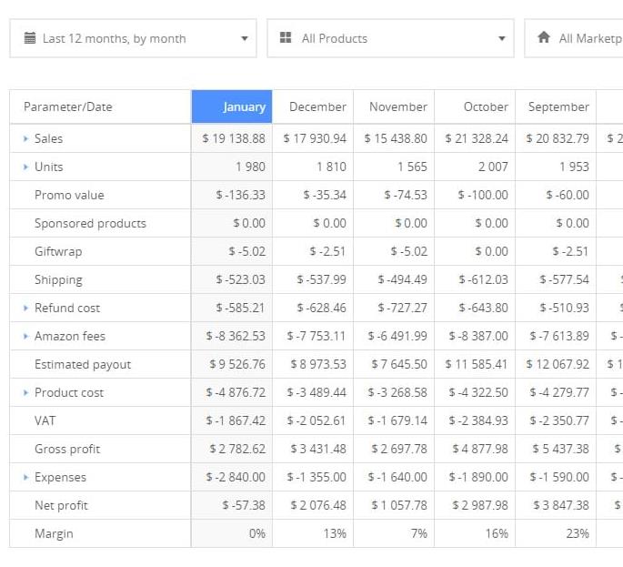 这是一个智能,可点击的损益表,能够专注于每个时间段的每个参数(例如,亚马逊费用)。 自定义日期的时间范围和粒度(例如,按月,按月,按月),按市场或产品过滤,查看在任何选定时间段内销售的产品。 为亚马逊卖家提供准确的商业智能!