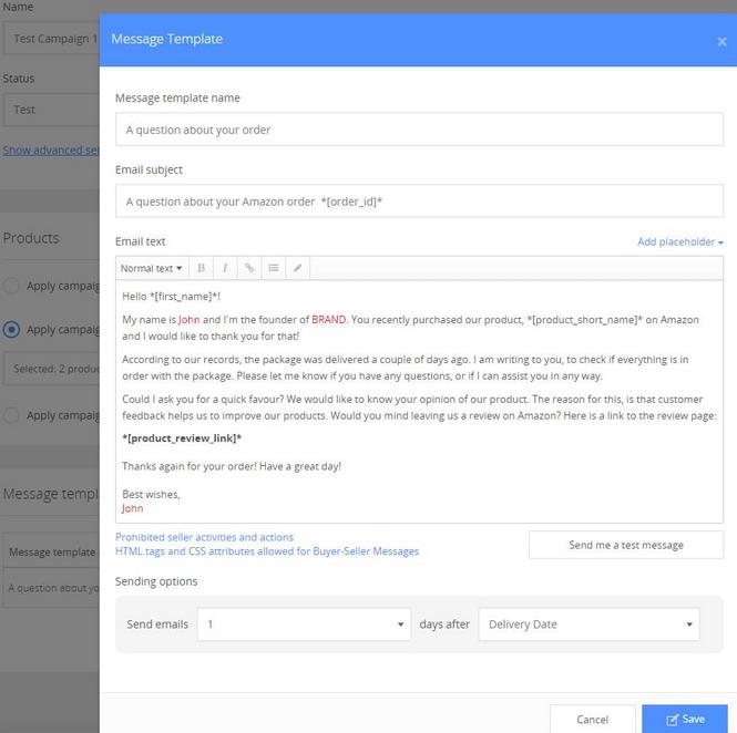 自动邮件回复和广告设置 向买家发送自动消息,收集更多反馈,产品评论并提供更好的客户服务。具有灵活设置的无限制广告系列,例按产品,国家,市场,回头客等目标进行定位。使用我们经过验证的预定义消息模板或自行设置。定义邮件到达的完美时刻(例如,产品交付的那一天)。