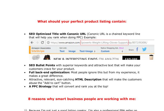 如果您的产品已在亚马逊上发布,请将ASIN号码发送给我。如果没有,给我发一些照片并告诉我一些关于它的话。另外,请向我发送一个亚马逊竞争对手的链接,以便分析产品说明。