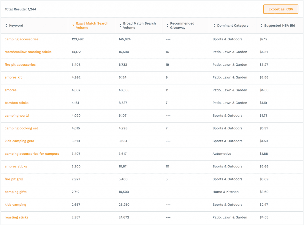 通过Keyword Scout可以找到1,244个关键词,并且这些新的关键词大多和这款产品高度相关。比如,人们也会在露营和篝火活动中使用marshmallow sticks,卖家把这些新的关键词添加到产品列表和PPC广告中就会提高产品展示次数,进而提升销量!