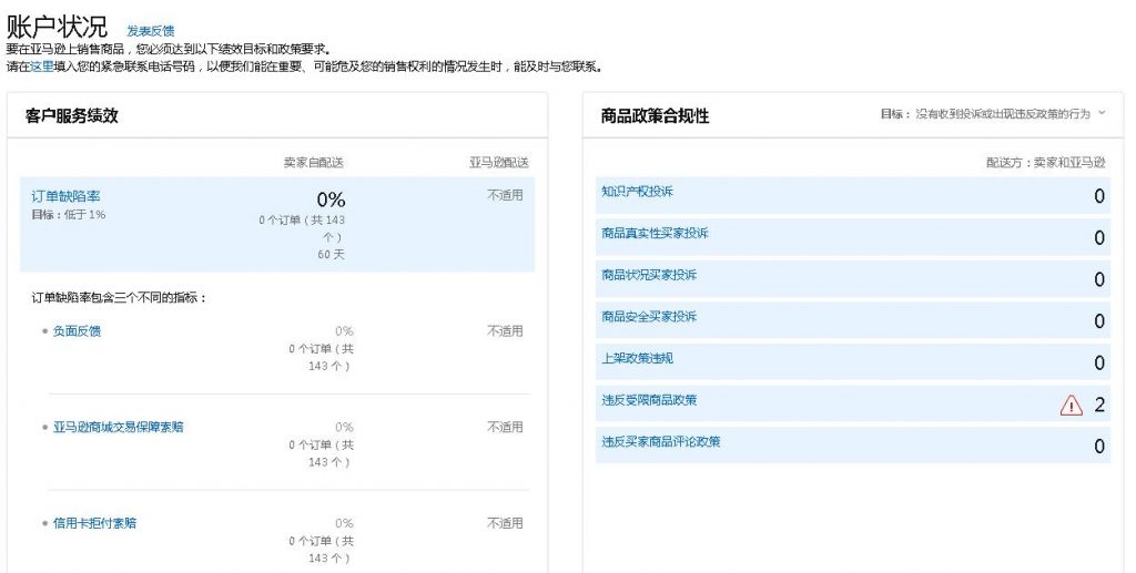 我们正在改进“帐户状况”体验,以便更轻松地解决政策违规行为以及可能导致销售帐户中断的问题。 我们不断添加新的问题类型,这些问题可以在卖家中心的其他地方,您的绩效通知收件箱中找到,或者立即通过电子邮件进行传达。 应快速解决此页面上的问题和违规行为,以确保您的销售帐户不会中断。