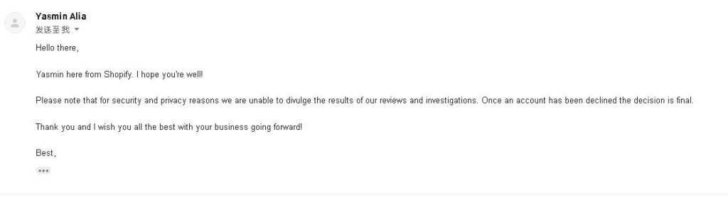 下面就是shopify封你账号不需要任何理由的解释, “请注意,出于安全和隐私原因,我们无法透露我们的审核和调查结果。 一旦帐户被拒绝,该决定将是最终决定。“