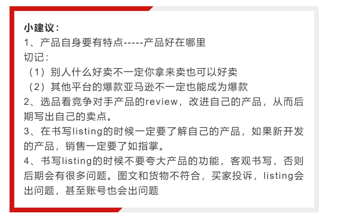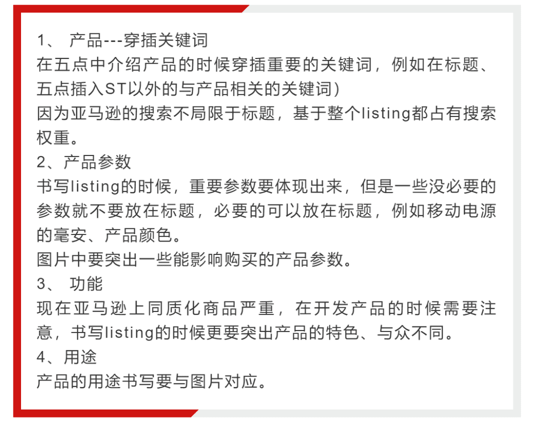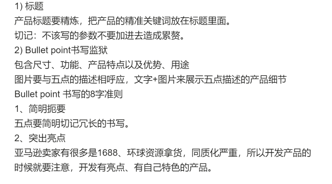 编辑产品listing的时候,标题、五点、描述要和产品有很高的相关度,众所周知不管A9算法、还是SEO优化,想要推广产品、提高排名,相关性是重点。