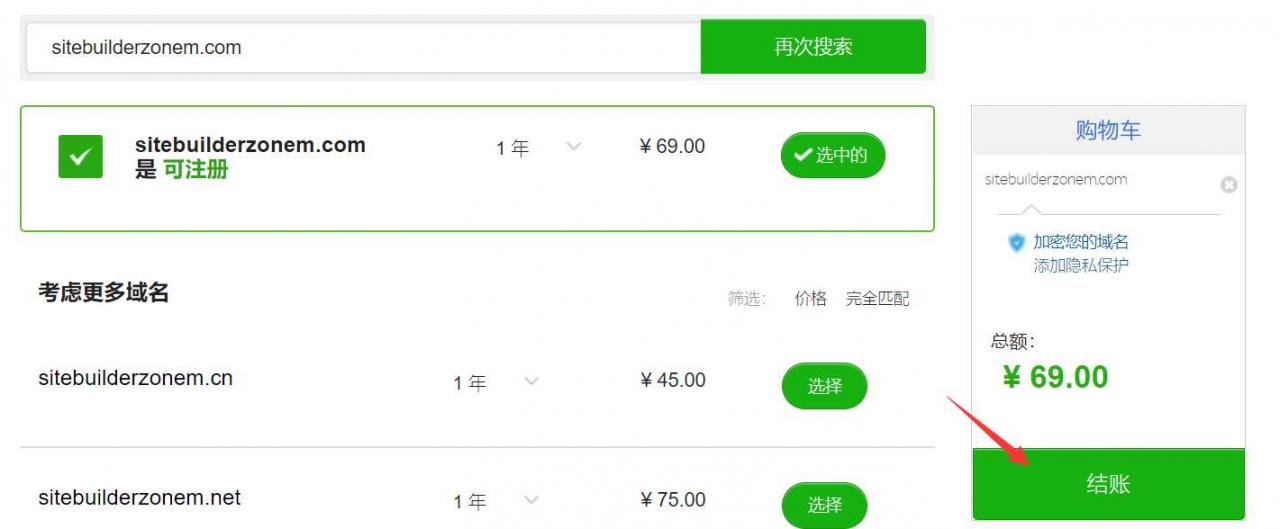 如果域名是可注册的话,那么就会显示“可注册”三个字。然后点击选中按钮,再点击结账按钮就可以购买这个域名了。
