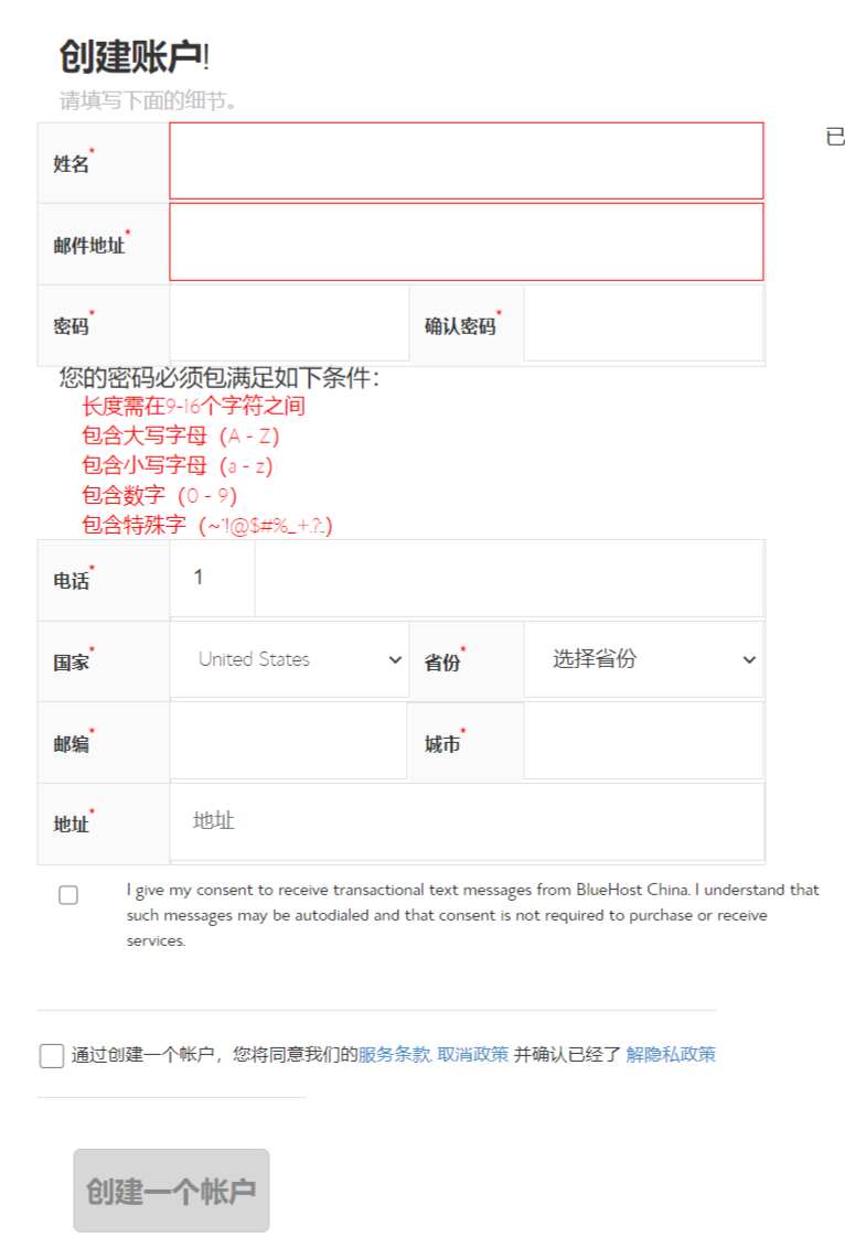 按照要求依次填入姓名(不能用中文,要英文或拼音),邮件地址密码等信息,然后点击“创建一个账户”按钮。