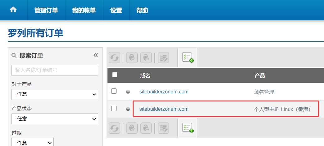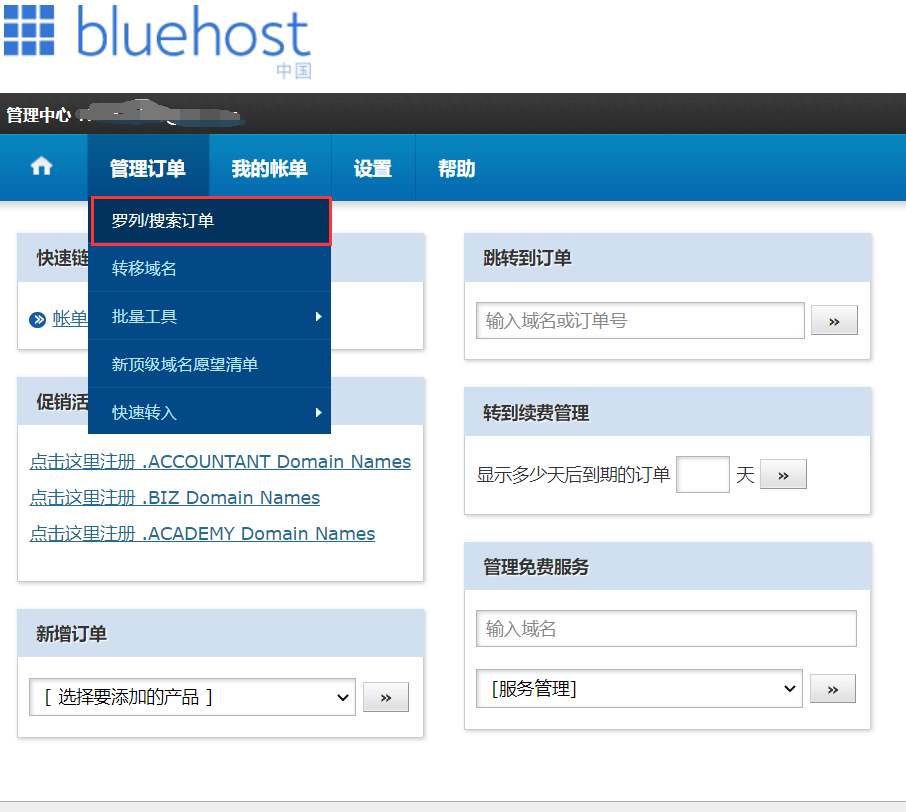 1.付款完毕后,登录Bluehost后台,鼠标移动到“管理订单 -> 点击罗列/搜索订单”。