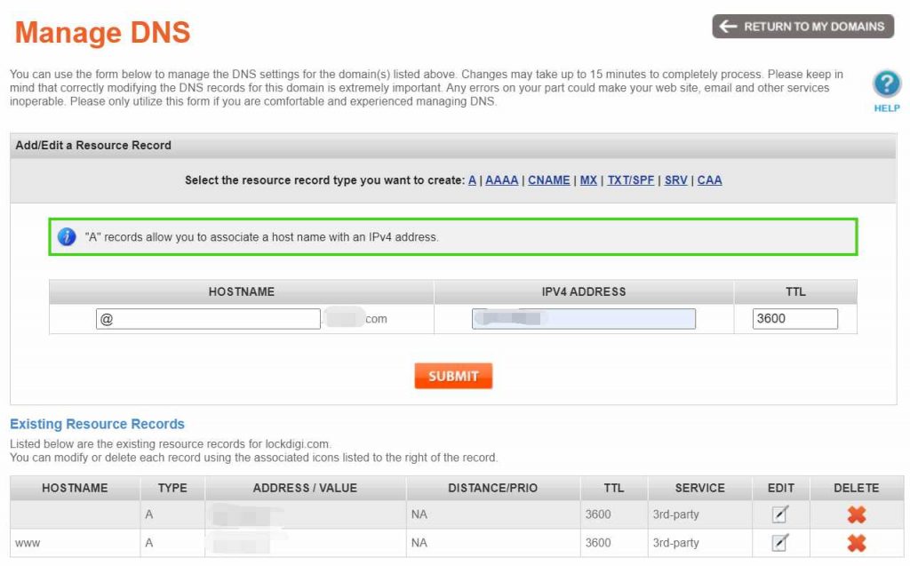 接下来,我们进入到Manage DNS界面,修改IP地址。”HOSTNAME”这里填写的是二级域名。您也可以不填写而直接添加IP即可。