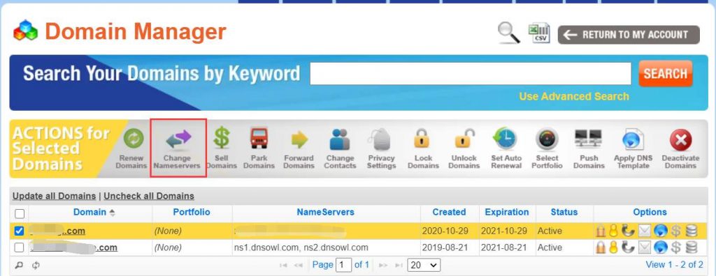 先点击选中要修改NameServer的域名,然后点击图中红框位置进入NameServer管理。