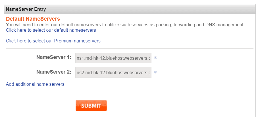 还记得您的 Bluehost 的NameServer记录吗?去 Bluehost 发送给你的开通邮件里找到它们(ns1.md-hk-12.bluehostwebservers.com,ns2.md-hk-12.bluehostwebservers.com),然后添加到“NameServer Entry”中并提交就完成了。