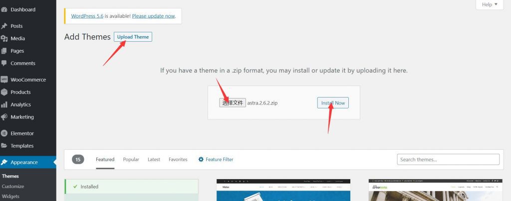 点击”Upload Theme -> Select file -> Install Now”,选中您要上传的主题文件。