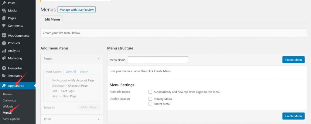 要设置菜单栏请转到”Appearance -> Menus”,您会看到这样的界面: