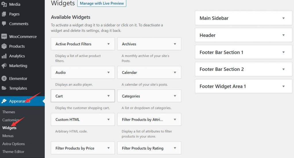 请转到”Appearance -> Widgets”,它在Menus的上面,进去后会看到: