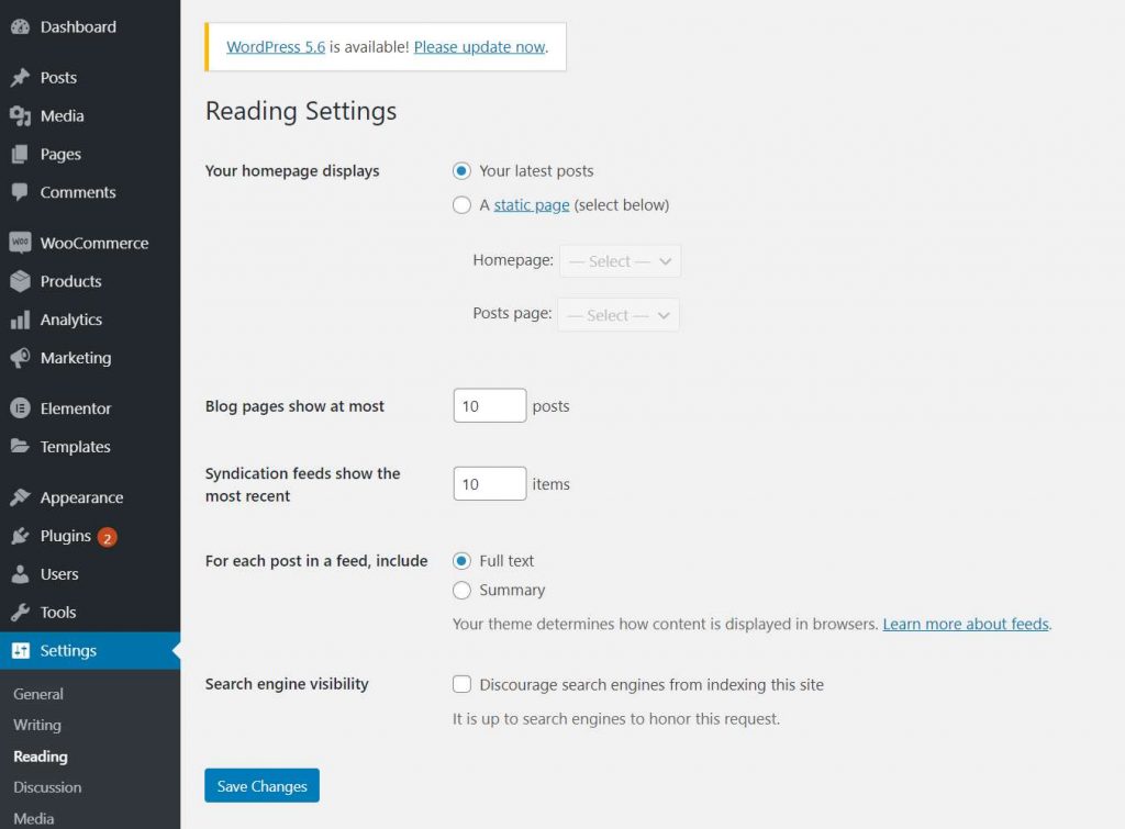 一个简单的方法是:将现有的页面设定为首页,要实现它我们需要转到”Settings -> Reading -> Your homepage displays -> A static page (select below)”。