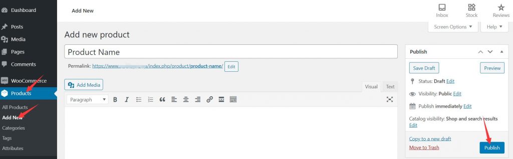 请转到”Products -> Add New”选项卡,想要发布产品您必须要填写标题,价格和产品图片才能称为一个产品页面。