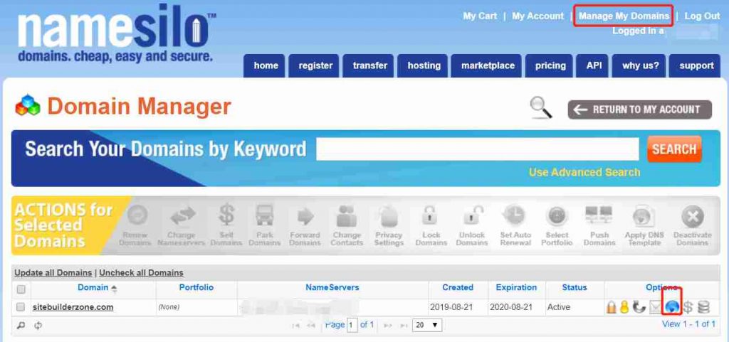 登入Namesilo后台后,点击Account domains的后面的数字进入修改DNS服务器地址
