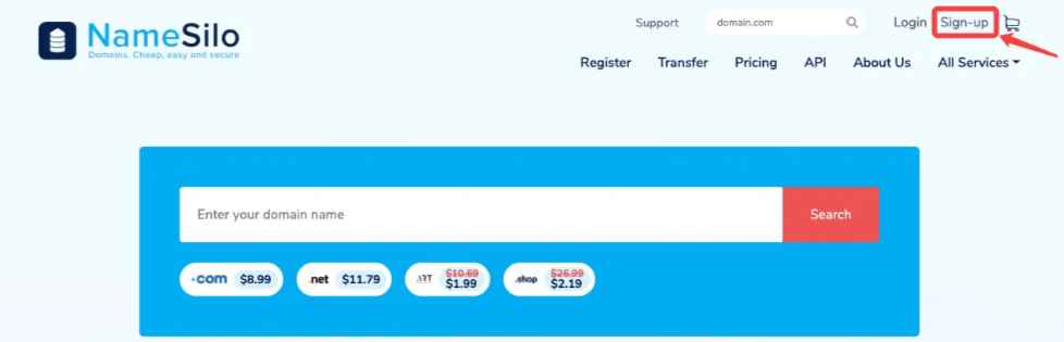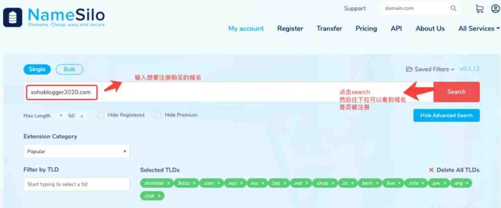 接下来就正式进入nameslio官网注册购买域名,namesilo是国外老牌的域名供应商,提供免费隐私保护,这样别人就不能通过你的网址查到你的信息,防止垃圾信息骚扰。