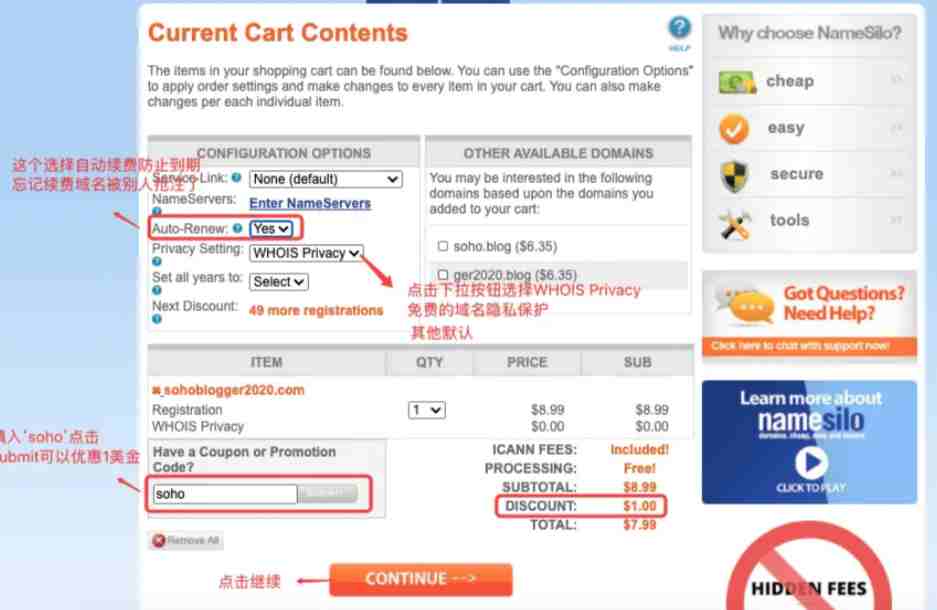 另外如果是首次在namesilo购买域名,填入“soho”这个优惠码可以优惠1美金,如上图,所有一个域名只要$7.99美金。(记得填入后要点击旁边的submit按钮,只适用于首次购买优惠1美金),点击continue继续进入选择支付方式页面。