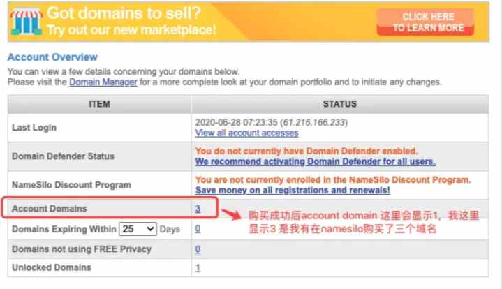 成功支付后重新回到Namesilo的账户,刷新一下,在account domain 这栏你会看到数字1,这样你就成功购买到了你想要的域名。