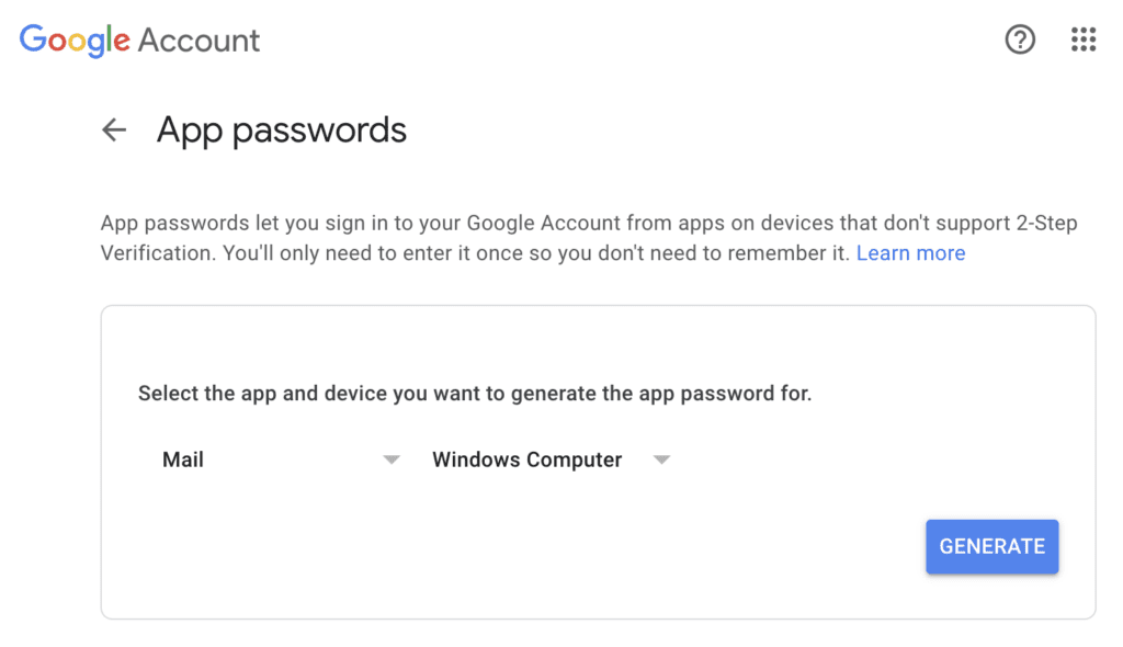 打开https://myaccount.google.com/apppasswords并创建一个新的“邮件”应用。在应用程序中选择“邮件”,在设备中选择“其他”。