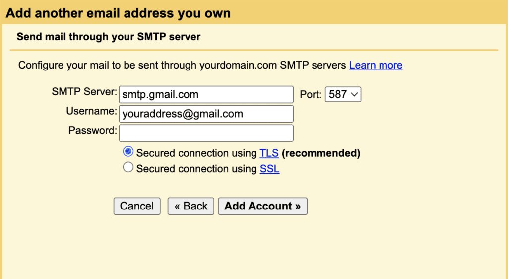 然后填写你的邮箱信息。SMTP 是 smtp.gmail.com,端口已经正确。用户名是你的 gmail 地址(包括 @gmail.com)。