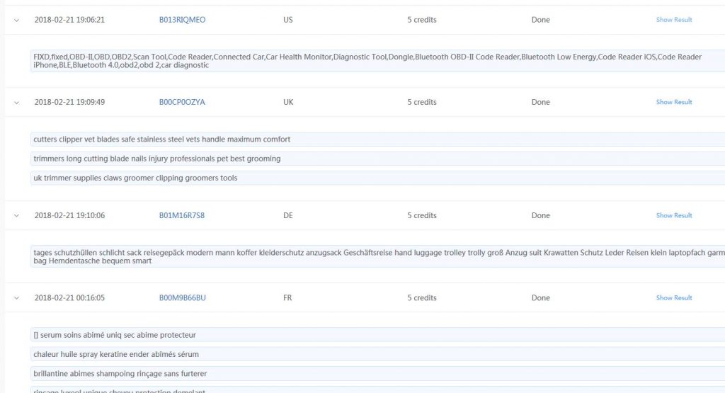 我们的系统正在亚马逊24/7上跟踪所有买家的搜索行为。只要有一位买家在亚马逊搜索关键字并最终点击ASIN X,我们的工具就会在ASIN X下记录该关键字。在这种情况下,当您输入竞争对手的ASIN时,该工具提供的所有关键字实际上都是被买家搜索并为您的竞争对手的产品产生真正的流量。因此,该工具提供的所有关键字对您而言都很有价值,因为即使没有人点击它,即使它被亚马逊索引,它也不会向您显示关键字。