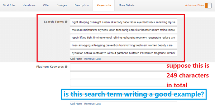 Search terms即搜索词,位于产品刊登界面的Keywords一栏,对于长度的限制,去年亚马逊大幅缩减了Search term的字符上限,目前印度站总共为200个字符,日本站为500字符,而其他站点都是250个字符(除了中国站),因此卖家数量最多的北美站和欧洲站目前都是250个字符的限制。