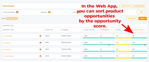 此外,当您使用Web App的Niche Hunter时,机会分数是帮助您找到产品的众多过滤器之一。